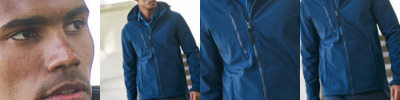 Warm-backed woven softshell XPT waterproof and breathable 3 layer membrane fabric. Fully printable outer fabric, with wind resistant inner membrane. Detachable softshell fabric hood, adjustable shock cord at face and cuff adjusters. 2 zipped lower pockets and 1 zipped chest pocket.