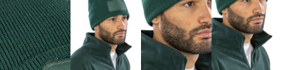 Double knit beanie made from 50% recycled materials. Cotton twill patch for printers. Double thickness. Full size style. Soft-feel knit. Deep cuff.