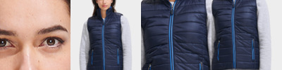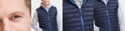 Polyamide 380T outer. Polyester padding. Contrast nylon lining. Showerproof. Fitted style. Collar high full length contrast zip. Two contrast front zip pockets. Self fabric binding on hem.