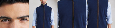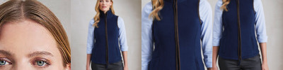 Sleeveless gilet with contrast trim detail. High-neck rounded collar, leading into a two-way zipper. Two zipped external pockets and two internal open pockets. Front and back panel detail. Contrast fabric hook on back of collar for hanging up.