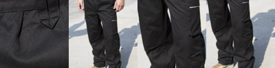 65% polyester/35% cotton. Windproof and breathable.Expandable waistband with belt loops.Zip fly with button over.Handwarmer side pockets.Rear pockets.Cargo pockets on both legs.Media pocket.Hammer loop.Knee pad pockets.Critical stress point bar tacking.Twin needle stitched seams.2" hem.