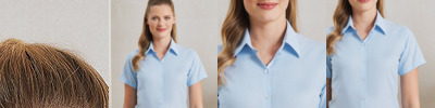 Mandarin collar with cap sleeve and front inner placket. Square buttons with fabric looped button holes. Two front darts, two back darts in a fitted style. Size: 8 10 12 14 16 18 20