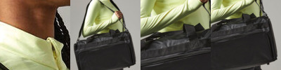 Retractable tow handle. Grab handle. Zippered front pocket. Internal compression straps. Side zippered pocket.