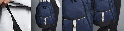 Ergonomic padded back panel, padded adjustable shoulder straps, detachable chest straps and waist strap, reflective strip, zippered small front pocket, front pocket organiser section, side pockets, headphone port.