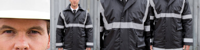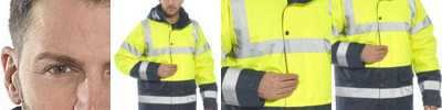 3M reflective safety tape, storm flap, zip opening back inside hem, zip away hood and concealed hood with drawcord, mobile phone pocket. Concealed access for print and embroidery.