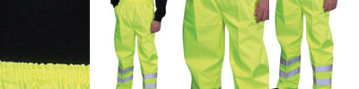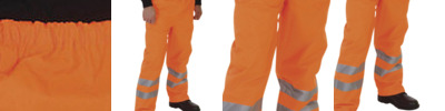Conforms to EN ISO20471:2013 Class 1, EN343 against foul weather and GO/RT 3279. Approved for railway industry. 100% waterproof Polyester with Oxford PU coating. Two 5cm wide reflective bands around lower legs. Elasticated waistband. Stitched and taped seams. Snap buttons on the bottom for adjustment. More colours available, code HVS461 & HVS463. Matching jackets, code HVP211, HVP300 & HVP303.