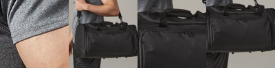 Detachable adjustable webbing shoulder strap with pad. Zippered end pocket. Zippered front pocket. Protective base feet.