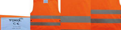 Conforms to EN1150. 100% polyester fabric with side elastication and press button. Two 50 mm width reflective tape around the body. Large front & rear area for decoration.
