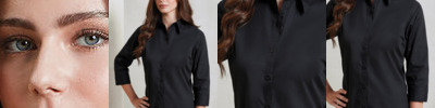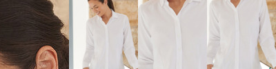 65% Polyester, 35% Cotton, plain poplin. Soft collar styling, rounded bottom hem. Fitted styling with bust darts and back darts. Easycare fabric. Pearlised buttons on light blue and white. Self coloured buttons on remaining colours. Size 6, 8, 10, 12, 14, 16, 18, 20, 22, 24, 26 * size 6 only avaialble in these colours
