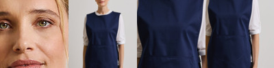 Side tabs with adjustable, stud-fastened closures. Colour-matched bias trim edges, large patch pocket. Crease resistant finish. Industrial laundry 85°C, domestic wash 60°C