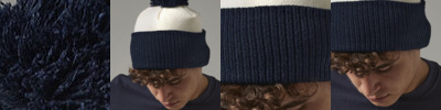 Double layer knit. Dual Style - Cuffed or Slouch. Ribbed cuff. Contrasting pom pom and cuff. Size One Size