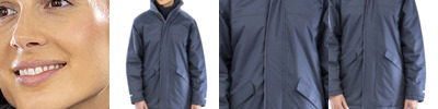 Fully taped waterproof seams. Long fit. Super warm. Quick drying. coordinating grey colour lining. Concealed 3 panel hood in collar with adjuster. Full front zip fastening. 2 front pockets. Inside pocket. Elasticated cuffs. Storm flaps. Lower back reflective tape. Reflective tape cuff detail. Fleece lined handwarmer pockets. Fleece trim on inside collar. Adjustable shock cords in lower hem. Embroidery access L shoulder and lower back. This garment contains over 25% of recycled materials. Waterproof. Windproof.