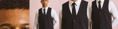 Contemporary style 4 button waistcoat with 2 functional watch pockets. Self fabric back.