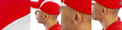 5 panel. Full profile. Pre-curved peak with 6 stitch lines. Hinged front support panel. No centre seam. Stitched eyelets. Easy tear release size adjuster.