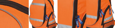 This fluo bright waterproof rucksack is designed for both work and leisure use; Made of 600D waterproof polyester; One main compartment with inside separation; Internal pocket for MP3 / iPod with rubber outlet for earphones; 2 side mesh pockets; Front expandable pocket to fit a standard ball / helmet; Webbed carrying handle; Adjustable padded shoulder straps; 25mm reflective strips on three sides. ISO20471 compliant fabric offers great visibility.