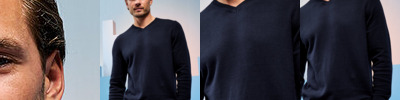 V-neck style jumper. Patch on the inside reverse neck for a contrast effect. Decorative tuck stitching. Ribbed knit on the neckline, cuffs and hem. Product contains no branded neck label. Removable Kimble or looped garment tags. Inner seam label holds important product information on one label with a second label containing brand information which can be cut-away. Please note old stock may contain a fixed branded label.