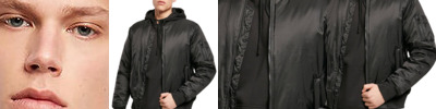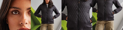 Slim fit jacket. Diamond shaped quilting. Bomber style jacket. Elasticated ribbed knit collar, cuffs and hem. Finishes just beneath the waistline. Full zip through bungee cord style zip. Interchangeable zip colours in orange and black. Two side slit pockets and internal zip pocket. Access point in internal lining makes for easy access for embellishment. Product contains no branded neck label.* Removable Kimble or looped garment tags. Inner seam label holds important product information on one label with a second label containing brand information which can be cut-away.