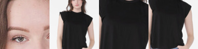 Side seamed. Relaxed, draped fit. Rolled cuff. Hi low raw bottom hem.