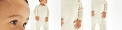 Envelope neckline. Scratch mitts which can be folded or unfolded as wanted. Integrated feet. Self-coloured poppers at neck. Tear-off label. Oeko-Tex certified. Organic 100 Content Standard certified.