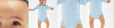 Envelope neckline. Binding at sleeve ends for shape retention. Soft and stretchy. Self-coloured poppers at crotch. Tear-off label. Oeko-Tex certified. Organic 100 Content Standard certified.