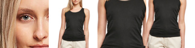 Tank top, sleeveless, low round neck, cuffs at hem, neckline and armholes.