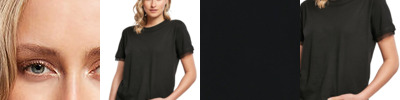 Lace at sleeve and hem, round neckline, short length. Oeko-Tex certified.
