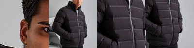 Wide external central storm flap with concealed coil zip, signature zip puller and internal storm flap with chin guard. Chunky rubberised stud fastenings on centre front. Horizontal stitched graded baffles. 245gsm polyester fill. Fully-lined in polyester matt finish. Self elasticated cuffs. Tonal coil zipped pockets with upper zip guard and self fabric piping around edges with rubberised edge trim. Glossy high shine face fabric. Internal double jet chest zipped reverse coil pocket. Product contains no branded neck label.* Removable Kimble or looped garment tags. Inner seam label holds important product information on one label with a second label containing brand information which can be cut-away.
