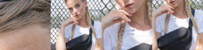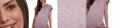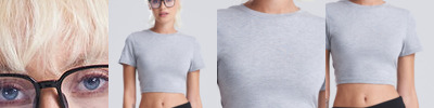 Cropped style T. Short sleeves. Girlie fit. Ribbed crew neck style with taped back neck. Twin-needle stitching detail on sleeve and bottom hem.