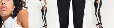 Elastic waist with drawstrings, side pockets, matching stripes inserted in the side seams, elastic leg openings. Oeko-Tex certified.