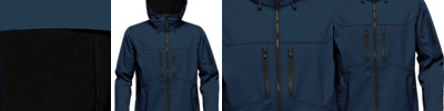 YKK® AquaGuard® zippers. Mechanical stretch. Full coverage, attached hood. Articulated fit. Grid back fleece lining. Chest pockets. Ergonomic hand pockets. Audio port.